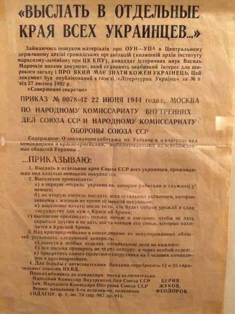 22 июня 1944 года Берия, Жуков и Феодоров получили приказ № 0078-42, согласно которому украинцев-патриотов должны были выслать за тысячи километров от родного дома. Задержания приказывали проводить внезапно и обязательно ночью, чтобы не оставить шансов на побег.