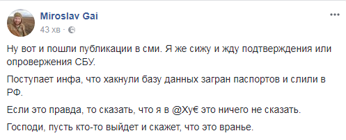 Мирослав Гай прокомменировал это так: "Ну вот и пошли публикации в СМИ. Я же сижу и жду подтверждения или опровержения СБУ.