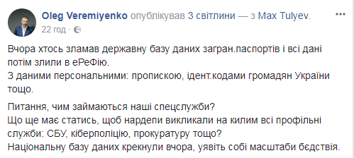 "Вчера кто-то сломал государственную базу данных загранпаспортов и все данные потом слили в эрефию. С данными персональными: пропиской, идентификационными кодами граждан Украины и др.", - утверждает он.