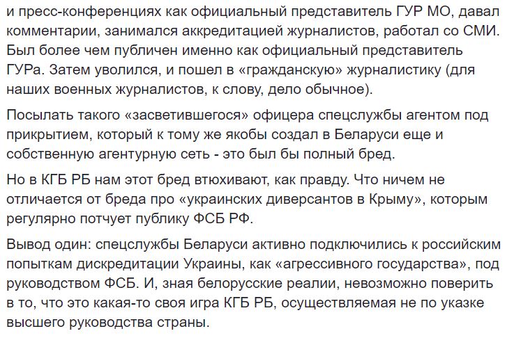 Комментируя арест Шаройко, он пришел к выводу, что белорусские спецслужбы начали открыто помогать ФСБ РФ в дискредитации Украины как “агрессивной страны”.