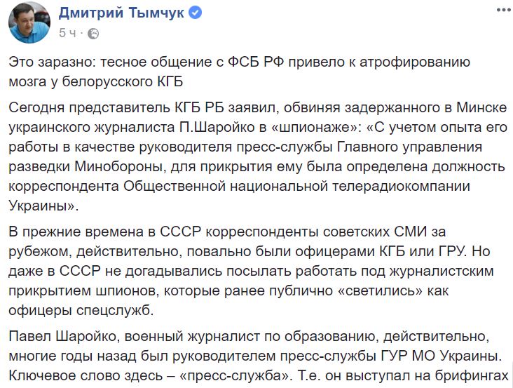 “Это заразно: тесное общение с ФСБ РФ привело к атрофированию мозга у белорусского КГБ”, - Тымчук постебался над версией Минска о “преступлениях” арестованного украинского журналиста Шаройко