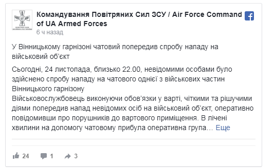 B свою очередь на своей странице в соцсети Facebook командование рассказало о неудавшейся попытке нападения неизвестных на воинскую часть.