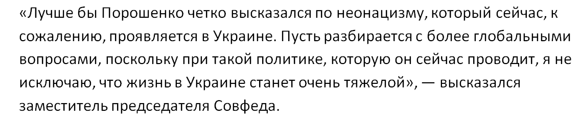 Российские власти крайне нервно отреагировали на призыв президента Петра Порошенко к покаянию Москвы за трагедию Голодомора. Так, первый заместитель председателя Совфеда по международным делам Владимир Джабаров заявил, что вместо этого Порошенко лучше заняться вопросом "неонацизма" в Украине, предрекая украинцам "очень тяжелую жизнь".