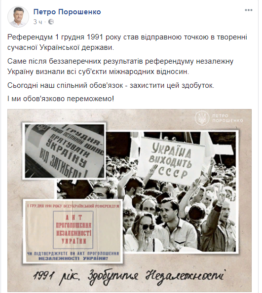 Порошенко в "ФБ" отметил, что референдум 1991-го – отправная точка создания современной Украины, передает "Диалог.UA".