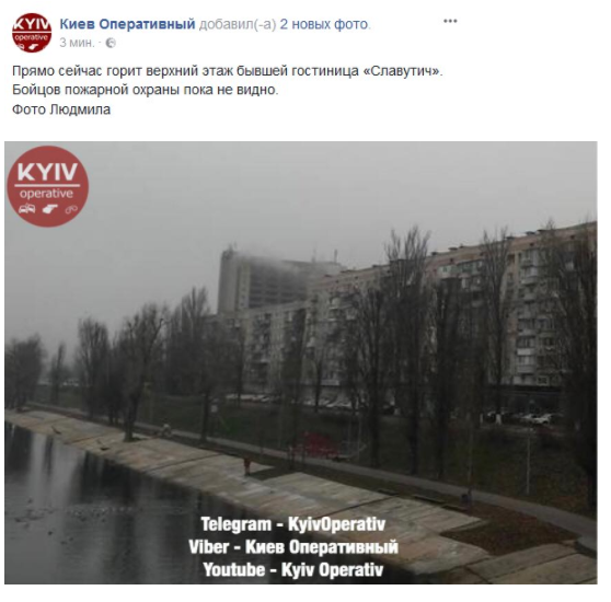 "Прямо сейчас горит верхний этаж бывшей гостиницы "Славутич". Бойцов пожарной охраны пока не видно", - говорится в сообщении.