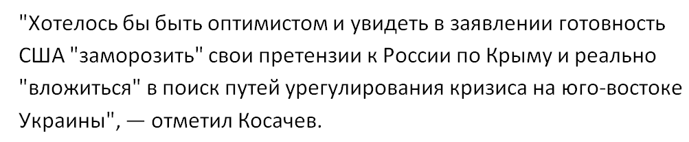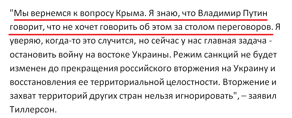 При этом СМИ отметили, что Тиллерсон публично выступил с крайне жестким заявлением в Вашингтоне, заявив о единственном условии снятия санкций: только после прекращения российской оккупации территорий Украины.