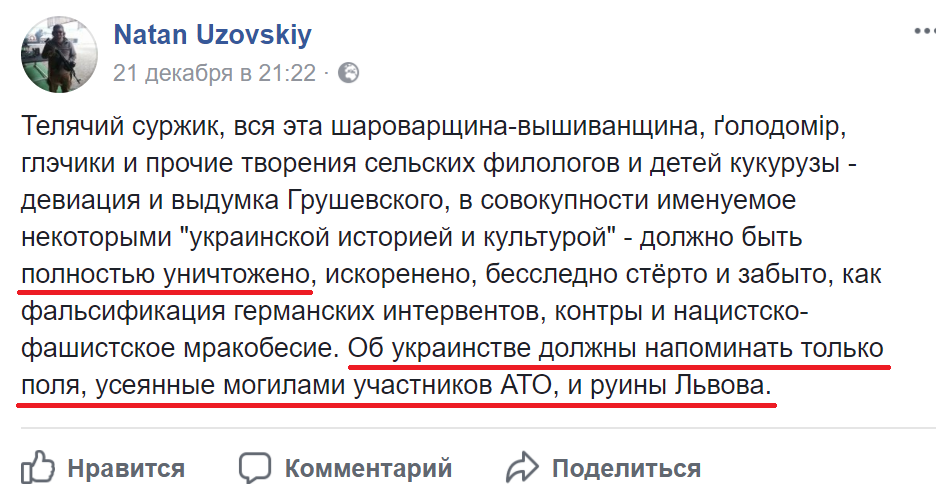 Террорист "ДНР" открыто пропагандируют фашистские идеи уничтожения украинцев и их культуры, мечтая о разрушенном Львове и погибших участниках АТО. При этом, несмотря на фашистское заявление россиянина, многие пользователи поддержали его.