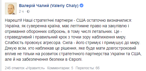 Валерий Чалый, украинский посол, в ФБ отметил, Штаты окончательно определились, что у Украины есть право на получение летального вооружения, передает "Диалог.UA".