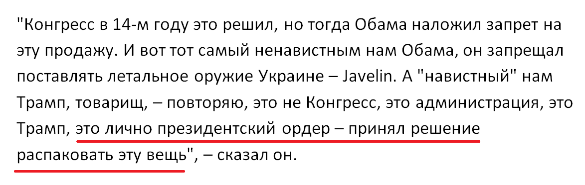 Он отметил, что ненавистный россиянам Обама несколько лет запрещал поставки летальных вооружений Украине, а поддерживаемый Кремлем Трамп лично поддержал приказ о передаче Киеву вооружений, сообщает "Диалог.UA".