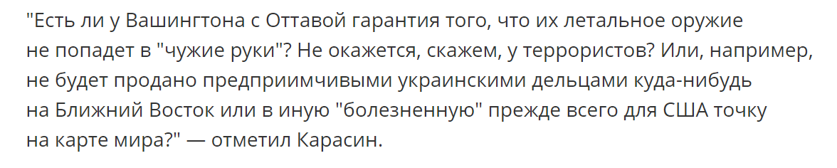 Более того, заместитель Лаврова в попытке сорвать поставки оружия США и Канады заявил о возможном попадании летальных вооружений из Украины в руки террористов на Ближнем Востоке.