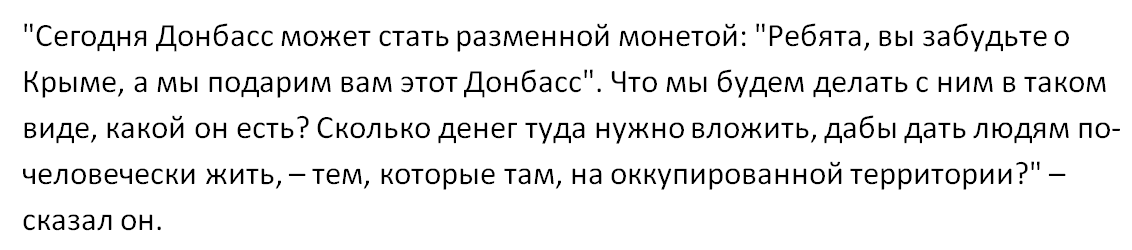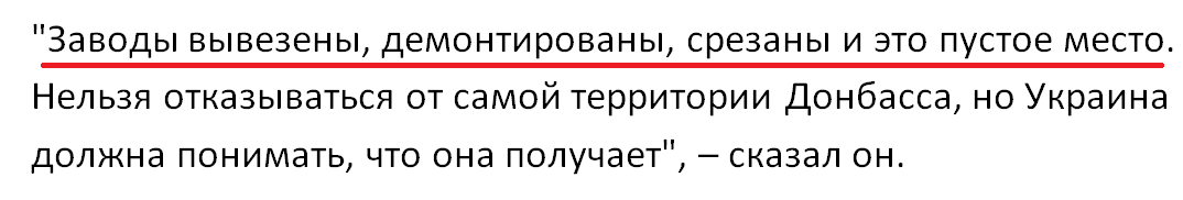 По его мнению оккупированные территории Россия превратила в "черную дыру", в которой демонтированы и вывезены в РФ целые предприятия и заводы. По мнению Еханурова, Украина не должна отказываться от Донбасса, однако необходимо отдавать себе отчет в том, в каком состоянии страна его получит.