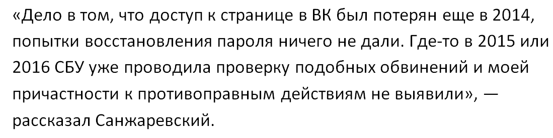 Санжаревский подчеркнул, что доступ к его странице в социальной сети потерялся 4 года назад, а восстановить пароль к своей странице он так и не смог.