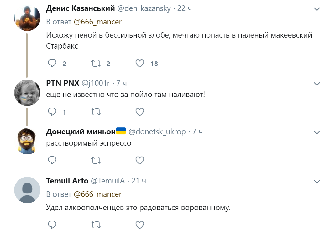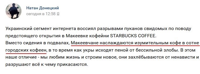 Боевики "ДНР" гордо заявляют о зависти украинцев к жителям Макеевки из-за предстоящего открытия в городе новой кофейни Starbucks Coffee. С ехидными насмешками на собственной странице в соцсети выступил первым сообщивший новость в Сети боевик Натан Донецкий, имя которого Анатолий Гелюх.