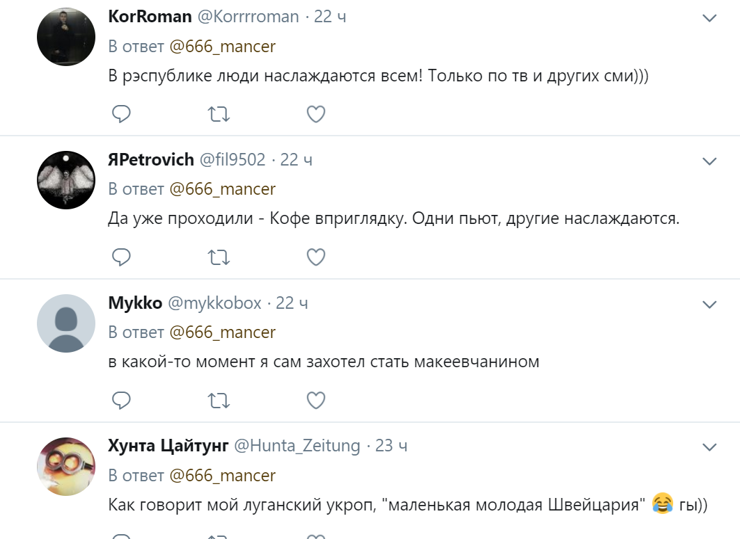 Наемник считает, что украинский сегмент Интернета утопает в зависти от того, что жители Макеевки наслаждаются "изумительным кофе в сотне городских кофеен", а украинцы лишь исходят пеной от бессильной злобы.