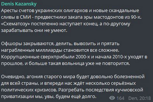 “Аресты счетов украинских олигархов и новые скандальные сливы в СМИ - предвестники заката эры мастодонтов из 90-х. "Схематозу" постепенно наступает конец, а по-другому зарабатывать они не умеют. Офшоры закрываются, делить, вывозить и прятать награбленные миллиарды становится все сложнее. Коррупционные сверхприбыли 2000-х и начала 2010-х уходят в прошлое”, - подчеркнул журналист, уточнив, что больше такой вольности им не будет.