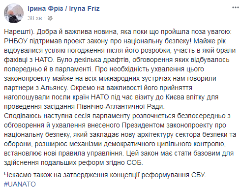 "Наконец. Добрая и важная новость, которая пока прошла без внимания: СНБОУ поддержал проект закона о национальной безопасности! Почти год происходили всевозможные согласования после его разработки, участие в которой принимали специалисты из НАТО. Было несколько драфтов, обсуждение которых происходило предварительно и в парламенте. О необходимости принятия этого законопроекта почти на всех международных встречах нам говорили партнеры из Альянса. Отдельно важность его принятия оглашали послы стран НАТО во время визита в Киев летом для проведения заседания Североатлантического Совета. Надеюсь, следующая сессия парламента начнется непосредственно с обсуждения и принятия внесенного президентом законопроекта о национальной безопасности, который закладывает новую архитектуру сектора безопасности и обороны, расширяет механизмы демократического гражданского контроля, устанавливает новые правила управления. Этот закон должен стать базовым для осуществления дальнейших реформ по СОБ. Ждем также на утверждение концепции реформирования СБУ", - пишет нардеп Ирина Фриз, которая в Раде отвечает за связи Украины и НАТО.