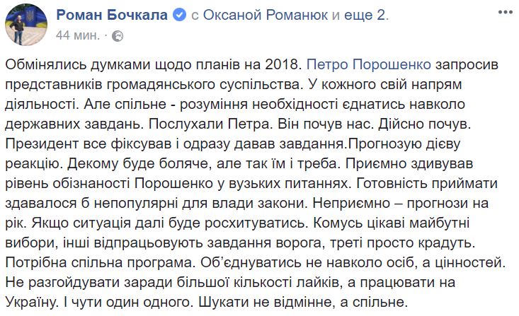 С его слов, на встречу были приглашены общественники, специализирующийся кажды на разной сфере. Обсуждались планы на 2018 год. Порошенко высказался сам и дал высказаться приглашенным.