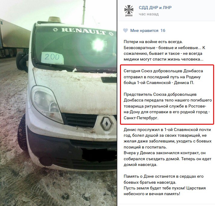 Российские наемники продолжают нести потери на Донбассе, возвращаясь в Россию в автомобилях с маркировкой "груз 200". Организация российских боевиков, которая носит название "Союз добровольцев Донбасса", заявила о гибели гражданина России из Санкт-Петербурга, тело которого было доставлено в Ростов-на-Дону для отправки на родину террориста домой.