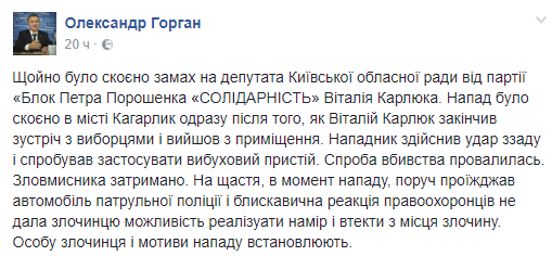 На депутата Киевского областного совета Виталия Карлюка совершено нападение.