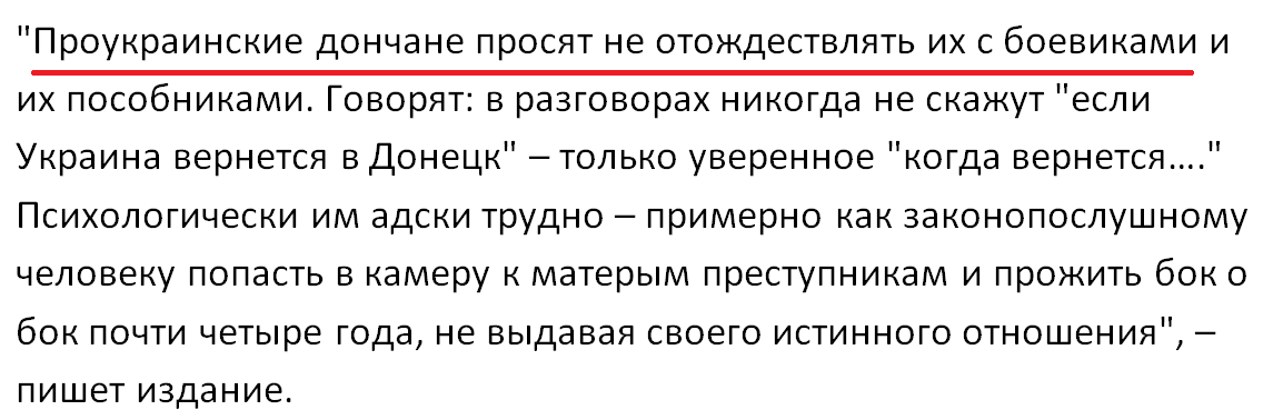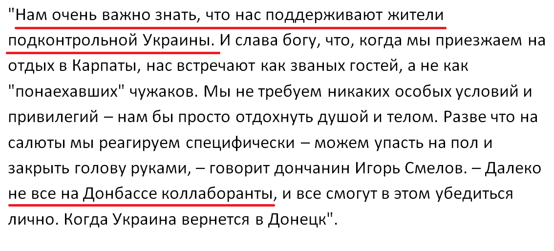 Один из жителей Донецка признается, что для проукраинского населения Донбасса очень важно знать о поддержке жителей со стороны Украины. Дончанин Игорь Смелов говорит, что в Донецке и на Донбассе далеко не все являются коллаборантами, а поездки в подконтрольную Украине территорию становится очень важной частью жизни для многих жителей.
