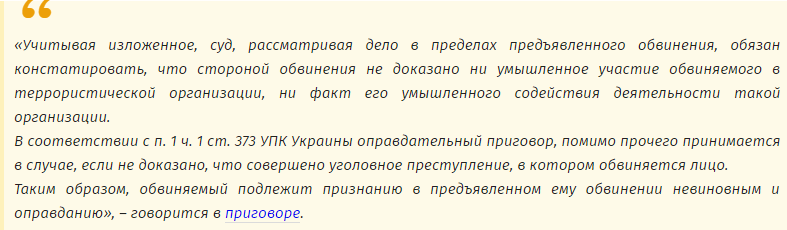 Однако, коллегия судей пришла к заключению, что доказательств в деле недостаточно. Стороне обвинения не удалось доказать, что подсудимый лично участвовал в действиях, которые попадают под понятие терроризма. Также суд отметил, что сторона гособвинения в данном случае фактически безосновательно отождествляет понятия таких незаконных явлений как "сепаратизм" и "терроризм", которые иногда и бывают тождественными за целью, но не всегда тождественны по средствам достижения этой цели.