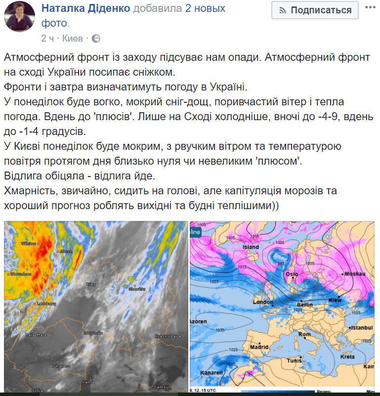 Вместе с тем синоптик Наталья Диденко заявила о наступлении атмосферного фронта, который принесет в Украину потепление и осадки. Обещанная синоптиками оттепель охватит Украину и будет сопровождаться облачностью и повышением температуры.