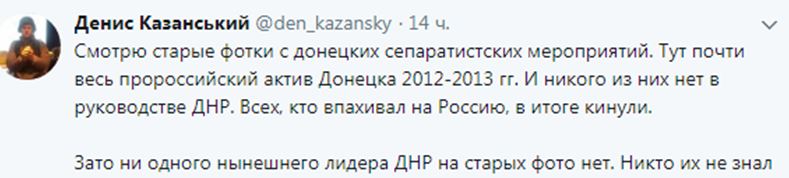 "И никого из них нет в руководстве "ДНР". Всех кто впахивал на Россию, в итоге кинули", - подчеркнул журналист.