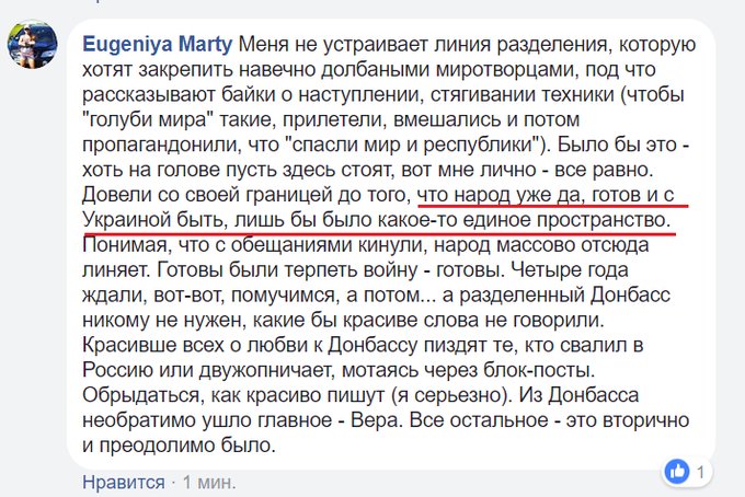 Женщина пишет, что линия разграничения на Донбассе возмущает местных жителей, при этом население уже готово к объединению с Украиной "в единое пространство", так как обещанные во время российской оккупации идеи так и не были реализованы.