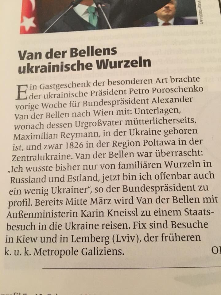 Соответственно, президент Австрийской Республики получил документы, которые доказывают, что прадед матери Ван дер Беллена Максимилиан Рейманн был рожден в Украине.