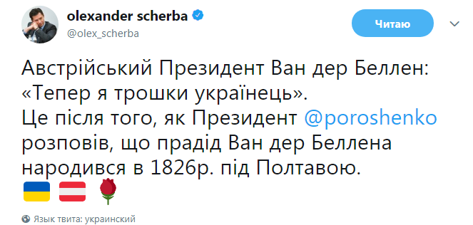 "До этого дня мне было известно лишь о родственных корнях в России и Эстонии, теперь я, очевидно, тоже еще немного украинец", - обрадовался глава австрийского государства.