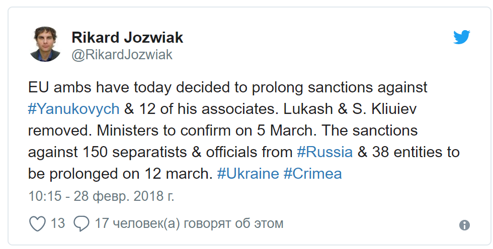 Кроме того, корреспондент добавил, что официально информация о продлении санкций против одиозного украинского экс-президента будет подтверждена на уровне министров стран Европейского Союза 5 марта.
