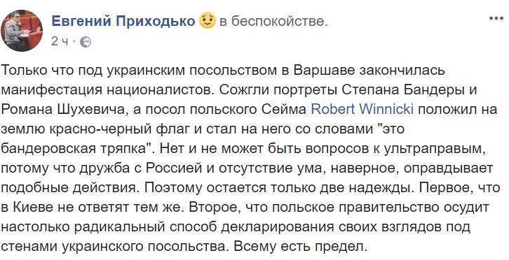 “Нет и не может быть вопросов к ультраправым, потому что дружба с Россией и отсутствие ума, наверное, оправдывает подобные действия. Поэтому остается только две надежды. Первое, что в Киеве не ответят тем же. Второе, что польское правительство осудит настолько радикальный способ декларирования своих взглядов под стенами украинского посольства. Всему есть предел”, - отметил Приходько.