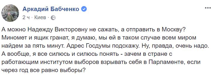 “А можно Надежду Викторовну не сажать, а отправить в Москву? Миномет и ящик гранат, я думаю, мы ей в таком случае всем миром найдем за пять минут. Адрес Госдумы подскажу. Ну, правда, очень надо”, - постебался “острый на язык” журналист над планами Савченко устроить теракты в Верховной Раде.