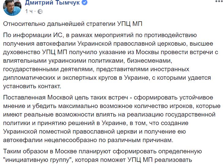 О новой стратегии УПЦ МП по украинской автокефалии рассказал в Facebook депутат Рады и координатор группы “Информационное Сопротивление” Дмитрий Тымчук, передает “Диалог.UA”.