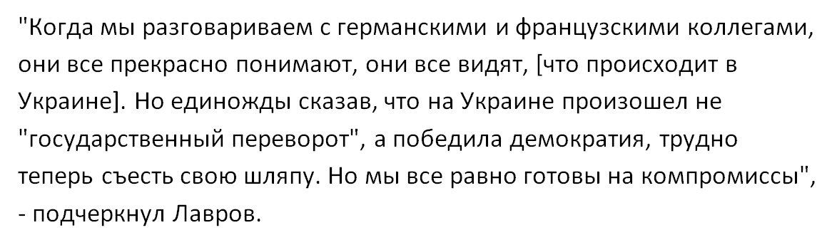 Глава МИД России продолжает настаивать, что во время Революции Достоинства в Украине произошел "государственный переворот", однако, несмотря на все, Россия готова к компромиссам.