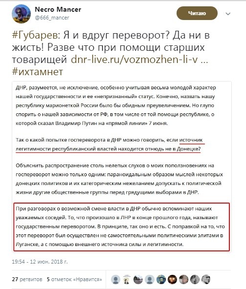На примере предпосылок и возможностей госпереворота Губарев рассказывает, что "источник легитимности республиканских властей находится отнюдь не в Донецке", и подтверждает это историей с переворотом в "ЛНР" против Плотницкого, где все решения принимались "сверху" из Москвы. В самой псевдореспублике "ЛНР" никто ничего с его самодурством, воровством и жестокими убийствами сделать не мог.