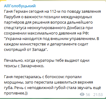 Кроме того, Голобуцкий отметил очередные изменения во внешности нардепа, обколотой ботоксом. Мол, морщины исчезли, а верхняя губа не шевелится. И от этого голос еще противнее.