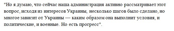 Советник американского лидера добавил, что сейчас в Вашингтоне активно рассматривают членство Украины в Североатлантическом Альянсе. Он напомнил, что еще администрация Буша пыталась ускорить процесс вступления украинского государства в НАТО, однако тогда представители европейских стран не согласились с программой Штатов.