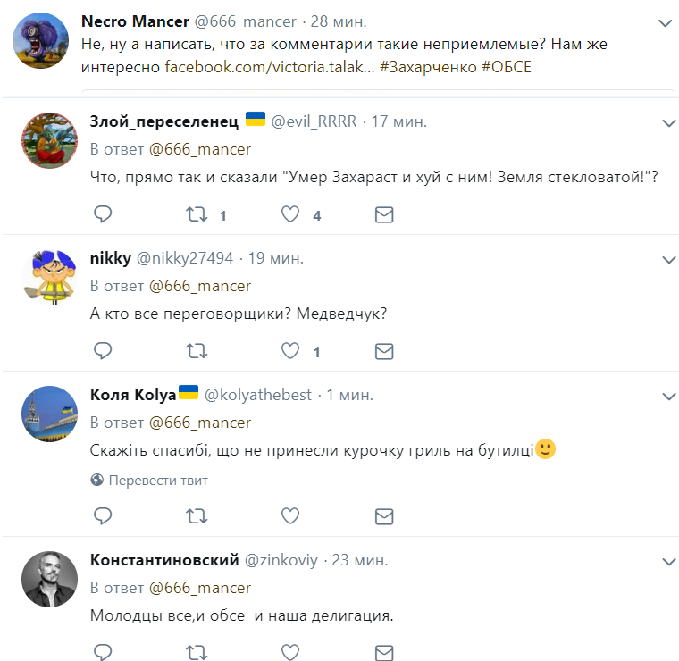 "Первое заседание переговорщиков в Минске после беспрецедентного убийства ... Захарченко началось с минуты молчания. Представители украинской делегации демонстративно покинули зал переговоров, позволив при этом неприемлемые комментарии", - с возмущением заявила Талакина.