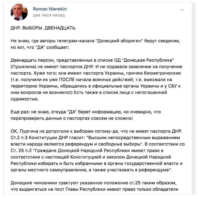 В своем Twitter блогер прокомментировал изречение российского пропагандиста Романа Манекина о том, что двенадцать персон из списка Пушилина не подавали заявление на получение паспорта "ДНР", при этом имея украинское гражданство, с которым, по всей видимости, не собираются расставаться.