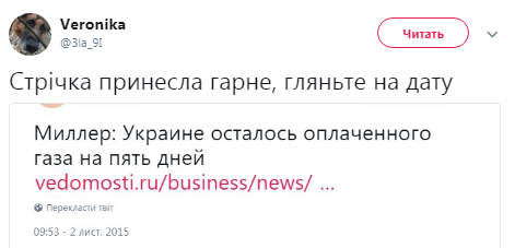 "Лента принесла красивое, посмотрите на дату", - написала пользователь, опубликовав скриншот новости за 2015 год о том, что, по заявлению главы "Газпрома" Миллера, у Украины осталось оплаченного газа всего на 5 дней.