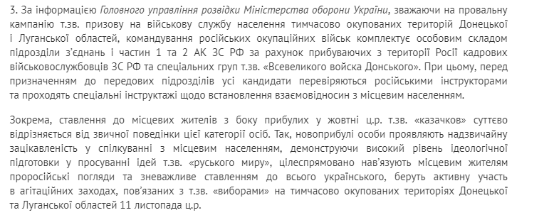 "Такие отряды целенаправленно занимаются навязыванием пророссийских взглядов жителям. Они говорят о том, чтобы жители Донецка и Луганска с пренебрежением относились к народу Украины и всему, что связано с этим государством. Такие отряды напрямую принимают участие в агитационных миссиях, поддерживая ставленников РФ", - сказано в сообщении.