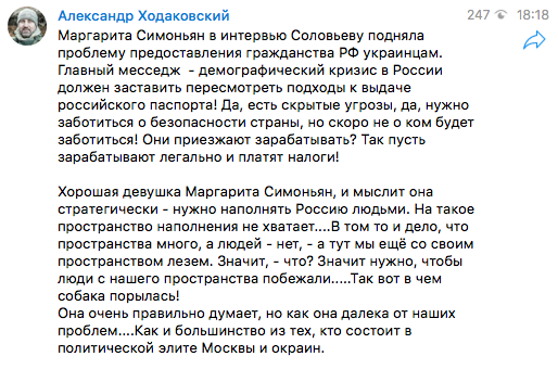 "Хорошая девушка Маргарита Симоньян, и мыслит она стратегически - нужно наполнять Россию людьми. На такое пространство наполнения не хватает… В том то и дело, что пространства много, а людей - нет, а тут мы еще со своим пространством лезем. Значит, что? Значит нужно, чтобы люди с нашего пространства побежали… Так вот в чем собака порылась!” - заподозрил террорист Кремль в намеренном усугублении ситуации на Донбассе.