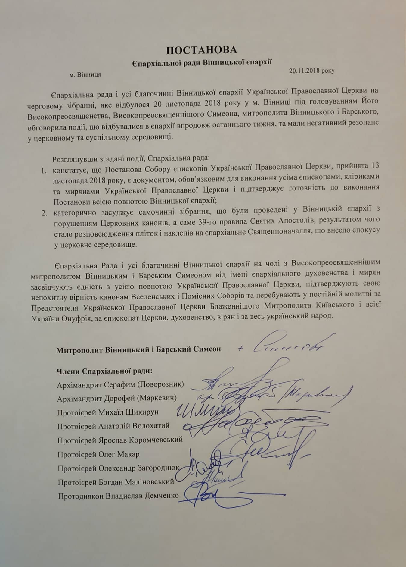 Однако внезапно он изменил свою позицию. Во вторник, 20 ноября, состоялось заседание Епархиального совета Винницкой епархии, на которой был утвержден резонансный документ.