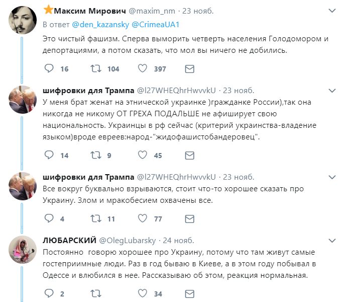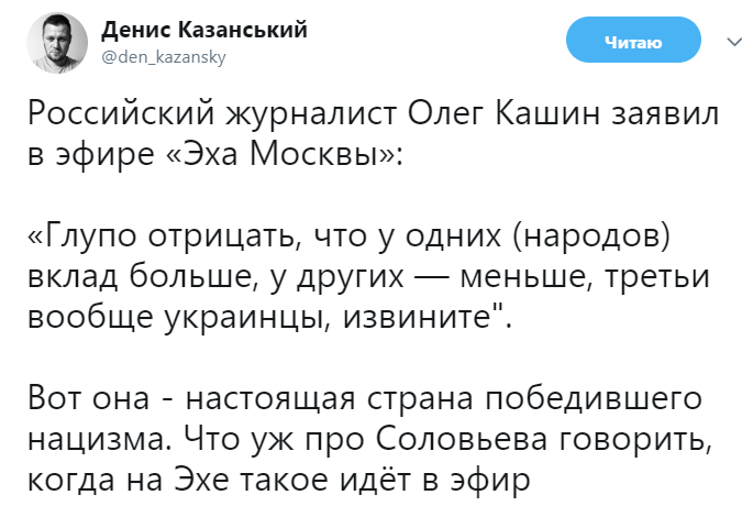 На одиозное заявление в адрес украинцев обратил внимание блогер Денис Казанский, процитировав на своей странице фашистское заявление Кашина.