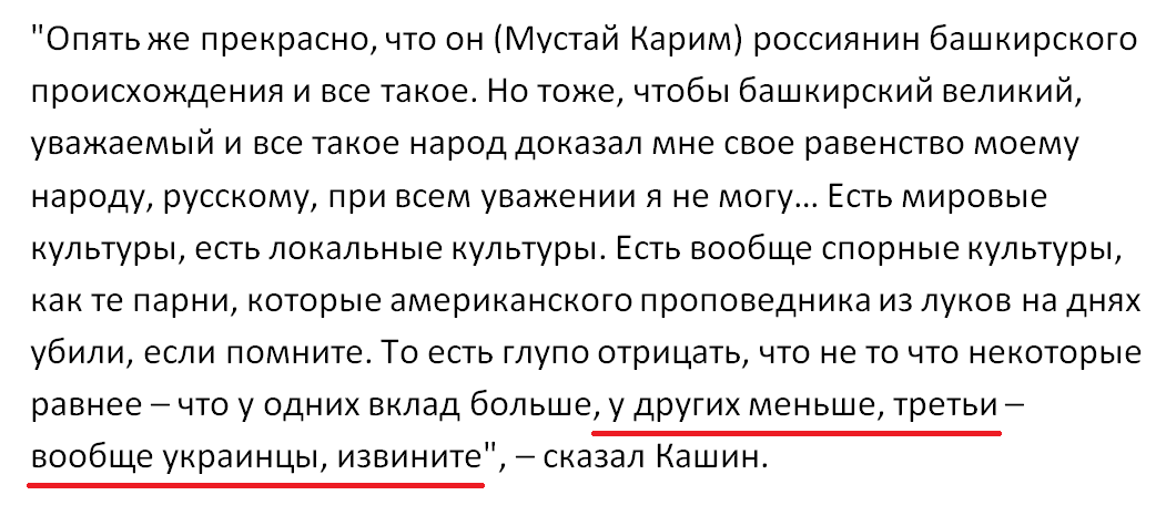 В прямом эфире Кашин бросился рассуждать о величии народов, пренебрежительно сравнивая разные нации - так например по его словам, "башкирский народ не доказал равенства русскому".