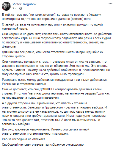 Трегубов отмечает, люди в России не хотят нести ответственность за действия своего правительства, так как не верят в то, что именно они его выбрали.