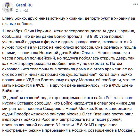 10 декабря соратники коллаборантки Бойко, любящей оскорблять Украину на росТВ, заявили о ее исчезновении. Оказалось, что эту даму схватили ФСБшники и отправили в центр для мигрантов. Сепаратистке грозит высылка из страны за нарушние режима пребывания.
