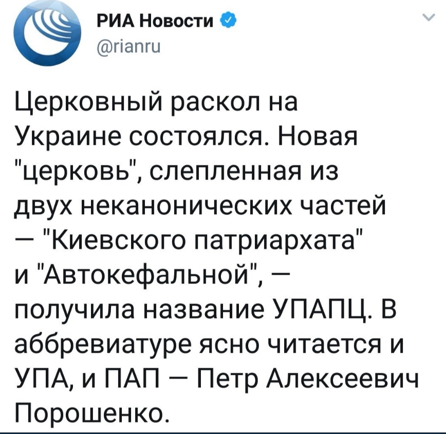 "Церковный раскол на Украине состоялся. Новая "церковь", сплетенная из двух неканонических частей ("Киевского патриарха" и "Автокефальной"), получила название УПАПЦ. В аббревиатуре ясно читается и УПА, и ПАП - Петр Алексеевич Порошенко".