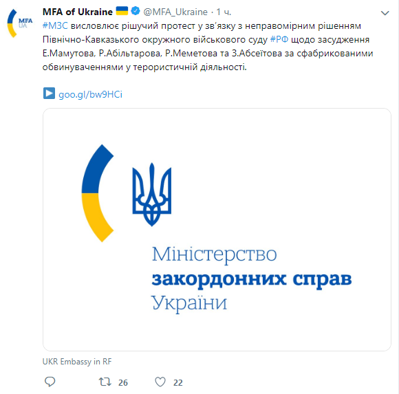 "Это решение в лишний раз подтвердило тот факт, что законодательство РФ, связанное с антитеррористической деятельностью, прикрывает политические репрессии против крымских татар", - сказано в сообщении МИДа.
